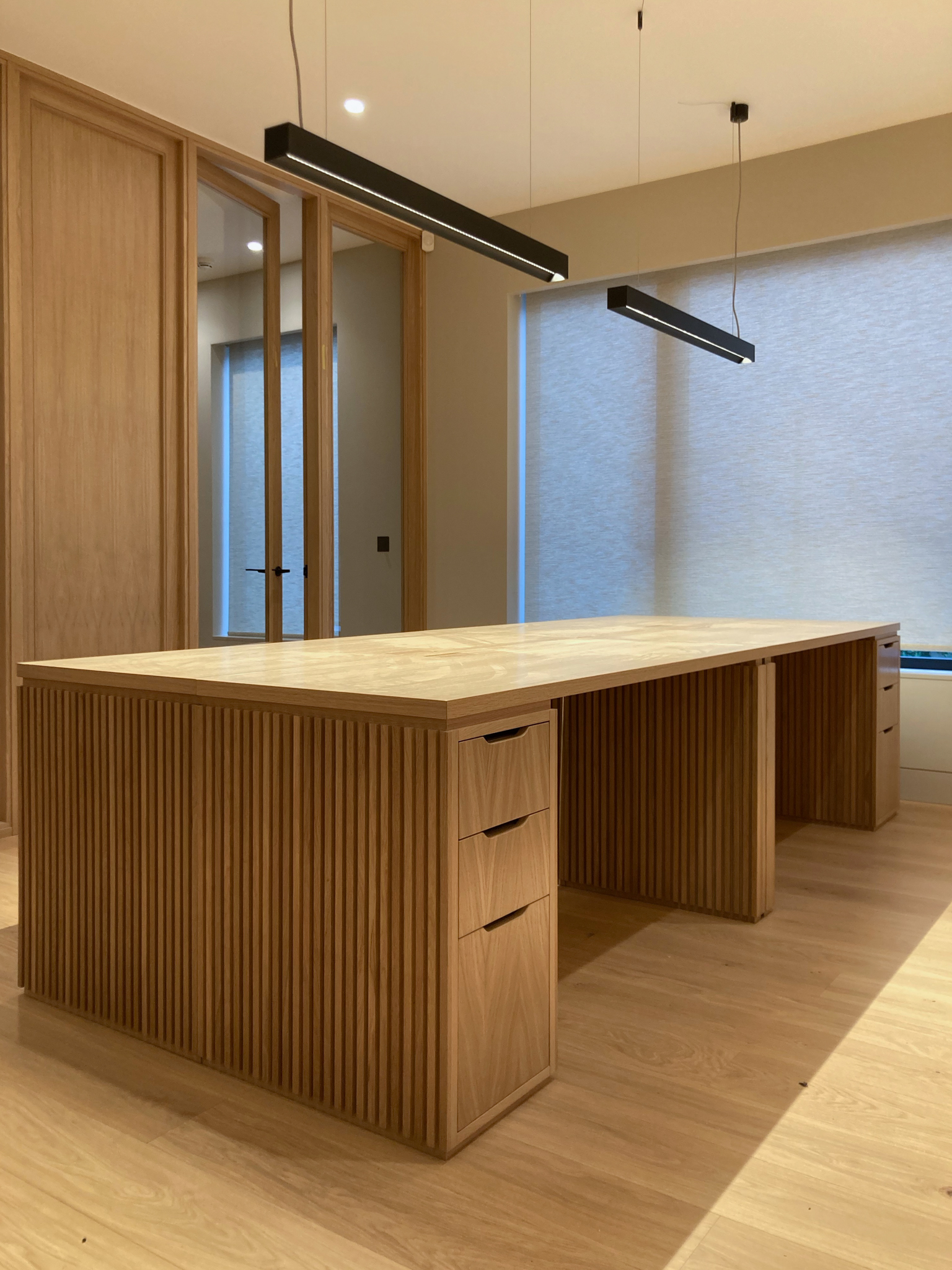 Project description: Interior designers De Rosee Sa tasked us with producing a package of office furniture to complement their refurbishment of a mews office for a company based in London's Notting Hill. In the main office area we made 2 large, 4-person desks with a mix of Oak veneer and solid Oak slats. These desks are modular so can be rearranged in different configurations or as stand-alone items. 2 more desks were made in a similar style for the private offices on this floor. We also made a large pill-shaped Oak veneer meeting table, with cylindrical legs and a inlayed veneer detail to give the impression the legs punctured the top itself. For the Director’s office on the top floor, solid Walnut was used for the desk, alongside a plinth to display a small sculpture. The project as a whole was longlisted for the Dezeen Awards 2022 in the Best Small Workspace Interiors category.